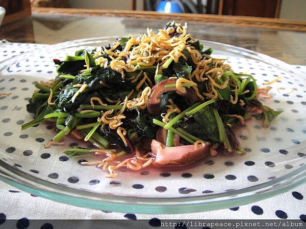 炒兩個配菜,有機紅莧菜炒香菇,盛盤後灑上一把山椒小魚,非常清爽好吃。