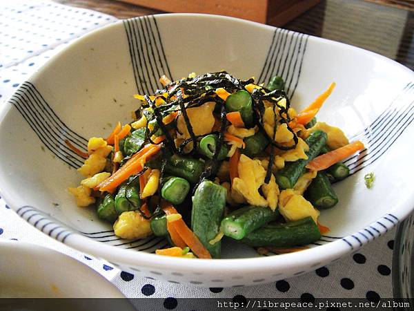 先熱油鍋炒蛋,盛起備用,接著爆香大蒜,炒胡蘿蔔絲和菜豆,加一點高湯去煮一下菜豆,不然菜豆不容易熟會有股豆腥味,然後甩鍋幾下把湯汁收乾,倒進炒蛋,一點鹽巴調味即可,盛盤後灑上海苔絲。
