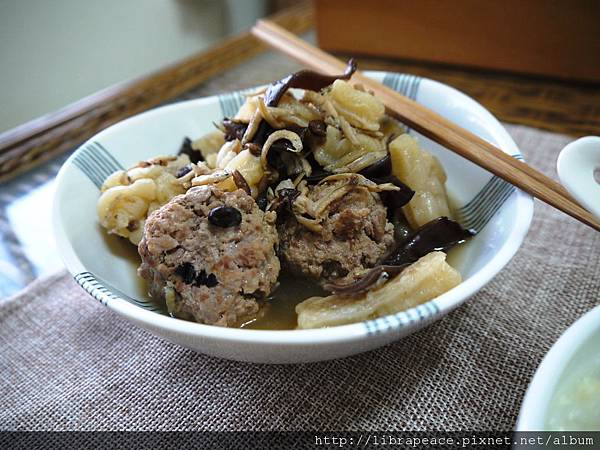 吃粥配的是婆婆給的苦瓜小魚燒肉丸子,鹹香軟嫩,配粥吃很好,吃了胃很舒服,吃飽了再回床上去睡一下,起來肚子就不痛了