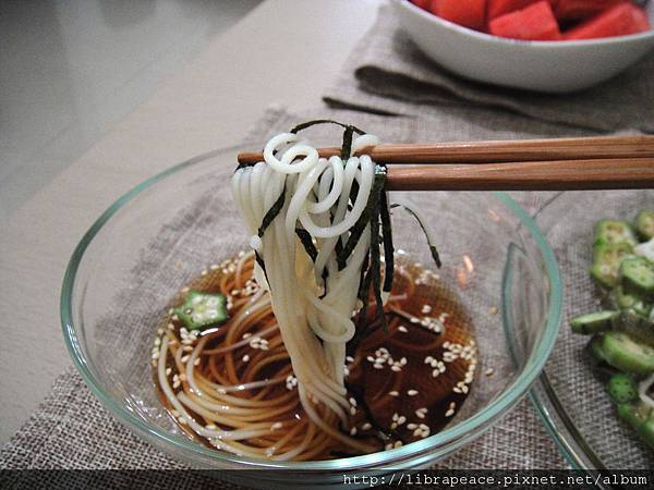 煮好的日式素麵在冰塊水裡涮過,配上燙秋葵和海苔絲,佐柴魚昆布芝麻麵味露一起吃,真涼快