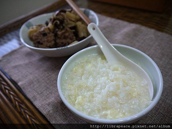 給自己煮了碗雞湯蛋粥來滋補滋補,先熬好雞湯,放涼後冰箱住一晚,隔天浮油都凝結在湯面上,用細目網杓撈掉所有浮油殘渣,拿這清清如水的雞湯來當粥底,加白米送進電子鍋去煮,粥快煮好之前幾分鐘電子鍋會倒數,這時再倒進一顆打好的蛋,關蓋子讓他繼續煮,然後就有這碗清淡但有滋味的雞湯蛋粥可食。