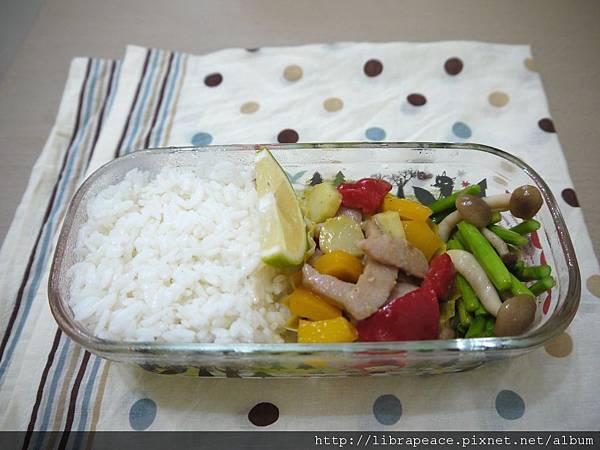 松阪豬切條,一點淡色醬油,一點酒,胡椒粉和太白粉抓醃一下,下鍋煎個兩面金黃,下紅黃椒和花椰菜心,然後加入醬汁(檸檬汁+糖+一點檸檬皮末+少許太白粉),翻炒甩鍋幾下讓醬汁都沾附在肉上並收乾,試下味道看是否還要加鹽,就可以起鍋了