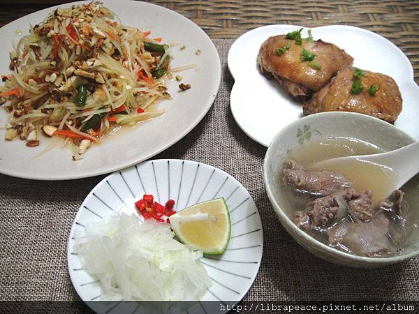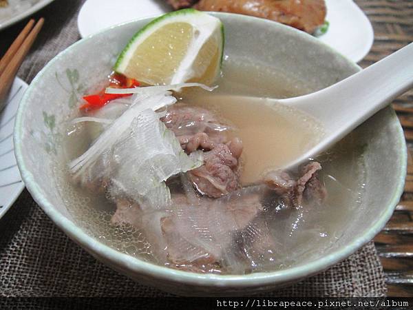 越式牛肉清湯,先燉好蔬菜高湯,牛肉片涮幾下,少許鹽調味而已,要吃的時候擱點洋蔥薄片,辣椒和檸檬角,東施效顰人家越南餐館來的吃法,很清淡但清甜的湯