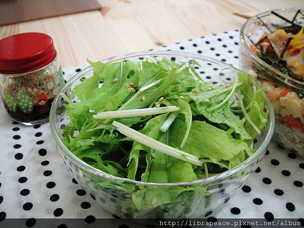 有機水菜用冷開水洗淨切好,記得得瀝乾水份才能裝盒,這樣生菜才不會軟爛掉並且保持脆度,我家沒有蔬菜脫水器,用廚房紙巾稍微壓吸也行,另外準備好沙拉醬,要吃之前才淋上去,水菜夏咖夏咖的好清爽~