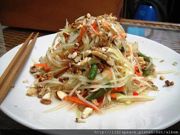 火辣酸涼的涼拌清木瓜,放了很辣的辣椒和很多烤香壓碎的核桃和櫻花蝦,無視羞恥為何物的本人獨嗑完一盤,吃得嘴唇成圈香腸嘴,很是過癮,