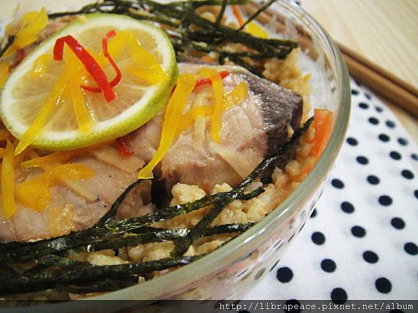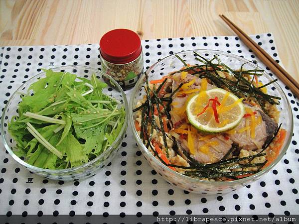 今天是清蒸魚便當,紅魽常常在日本料理店以生魚片登場,這魚肉質細膩滋味清甜,今天清蒸來吃,簡單舖點薑絲和去籽的辣椒絲,一匙淡口的柴魚醬油下去,蒸鍋裡水滾了才下鍋去隔水蒸八分鐘,就有好吃的清蒸魚了。