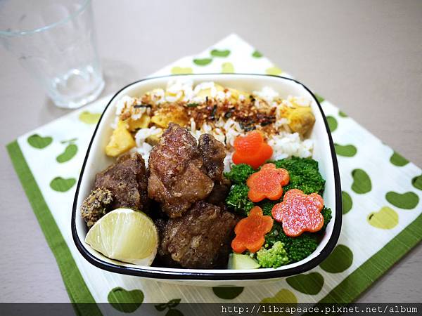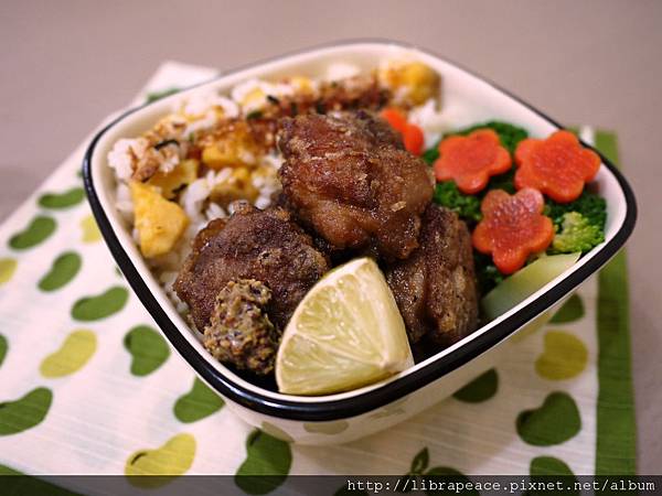 今天的便當是相當邪惡的炸雞便當~偶爾,人生總是會需要這種油滋滋的油炸物來滿足口腹與心靈,天天吃清淡少油少鹽少糖滴酒不沾,那人生跟條鹹魚有什麼分別。
